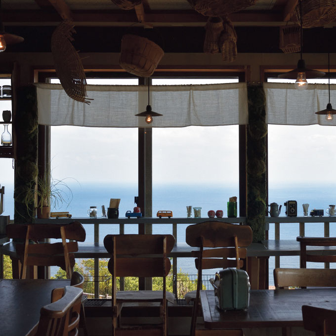 千畳敷の高台に建ち、絶景をひとりじめするかのように佇むカントリーキッチン。立地を生かした建物は全面ガラス張りで、こぢんまりとした空間ながらまるで外にいるかのような開放感です。風合いのあるカントリー調の雑貨を散りばめたおしゃれな内装も◎。