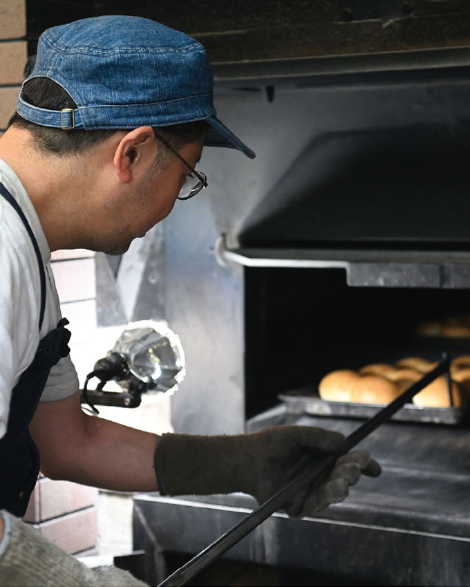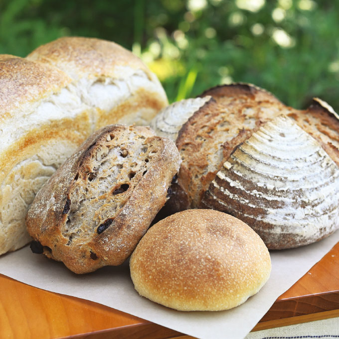 広島から移住してきた大樂さん夫妻が営む大樂堂は、田畑の中にポツンと佇む一軒家。「薪窯パン」と大きく書かれた看板が目印です。自家製の天然酵母・サワードゥと小麦粉、塩、水のみでつくられるパンは粉の風味が強く感じられ、ほんのり酸味が効いています。ラインナップは約12種類。