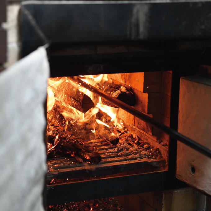 厨房には、自分たちで設計してレンガを積み上げてつくったというフランス式の薪窯があります。下側のスペースで薪を燃やし、「グラ」と呼ばれるパーツから上部に火を噴き出させる構造。パンを一通り焼き終えたらピザに取り掛かります。