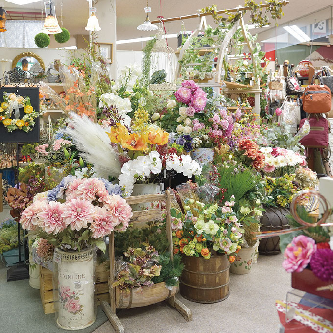 また、お花屋さんと見間違うほど充実したアートフラワーも自慢のひとつ。「潤い生活をお手軽に」をモットーに、上質なものを良心的な価格で提供しています。