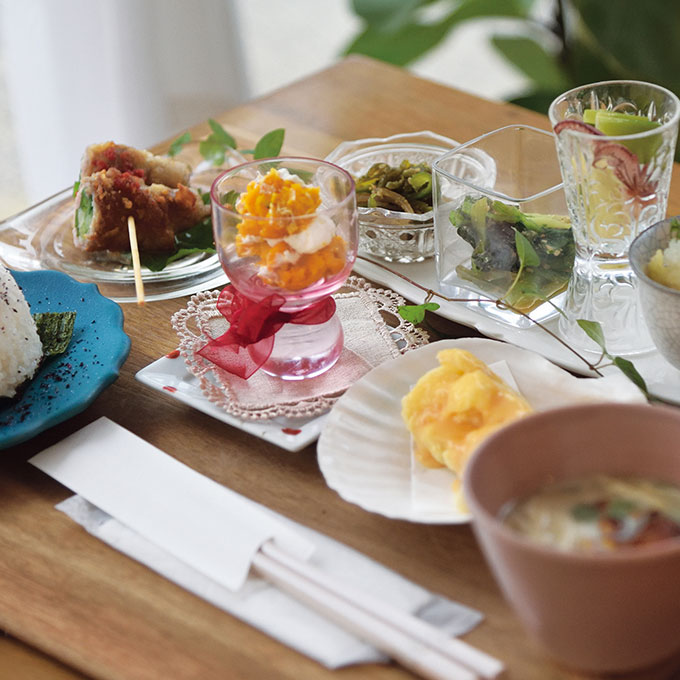 船木さんがつくるおむすびはちょっと個性的で、まるでお花がパッと開いたようなビジュアル。口の中でホロッと崩れる絶妙な食感にもコツがあるんだとか。どのメニューも女性の「好き」に応えるものばかり。作りたて、盛り付け、うつわ使いにもこだわっています。
