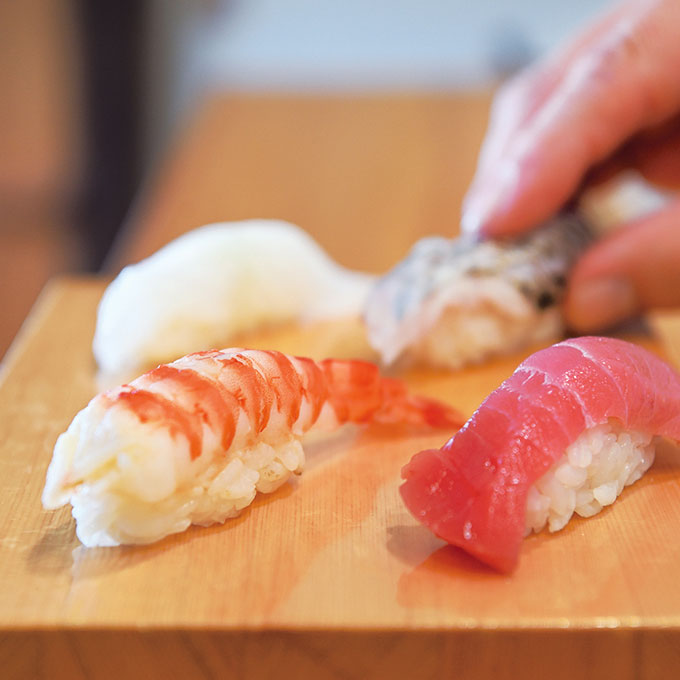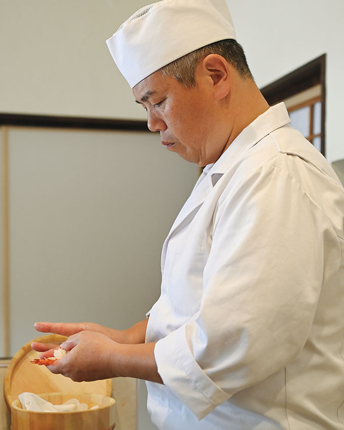 使う魚介は地元で捕れた旬のものを中心に、時期や海の状況など、漁師さんとも密なコミュニケーションを図っている店主の岡本文夫さん。目の前で寿司を握りながらもてなす「出張にぎり」も承っています。