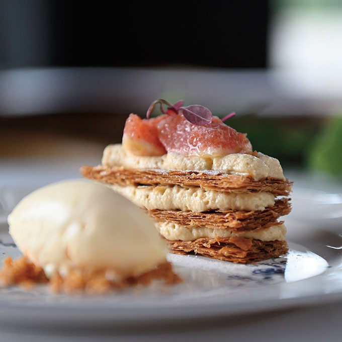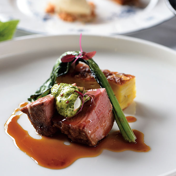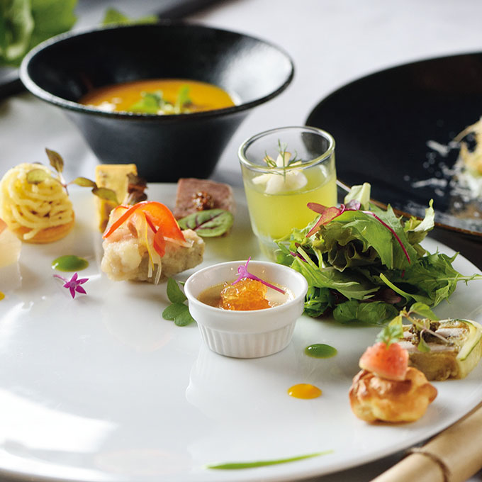 コース料理に登場する前菜はカプシーヌならでは。余白の美を意識して10種類のメニューをバランスよく配置したプレートは、まるでお花畑のよう。食事はコース仕立てで、繰り出される洗練された品々にうっとりします。