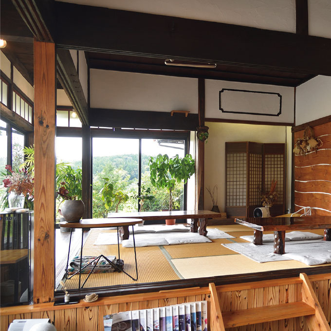 のどかな風景が広がる安芸高田市高宮町。道路沿いに立てられた小さな看板を頼りにゆっくり車を走らせていると、やがてお店らしき日本家屋が見えてきます。店内からは四季折々の景色が眺められ、穏やかなくつろぎの時間が過ごせます。
