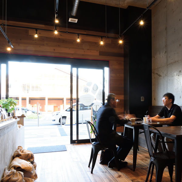 JR廿日市駅北口のロータリー前にある、スタイリッシュな外観のオムニバスロースターズトーキョー。木とコンクリートをバランスよくミックスしたミニマルな空間は、老若男女誰もが心地良く過ごせます。